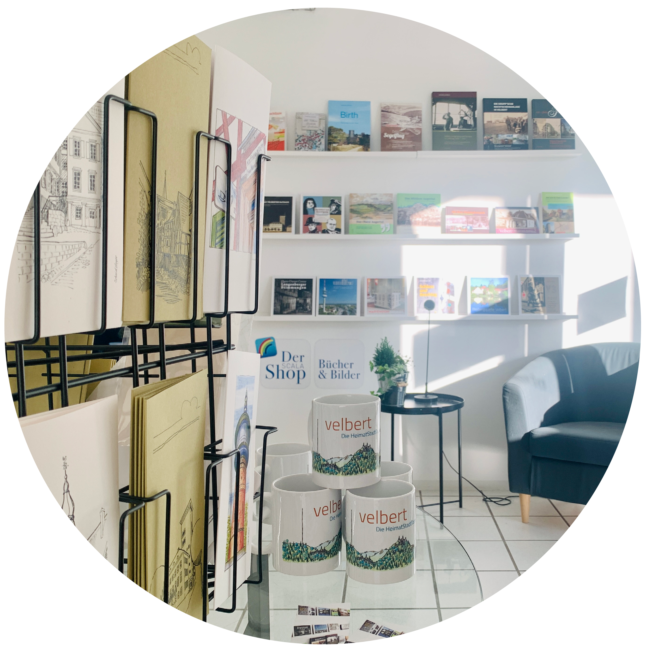 Der SCALA Verlag hat auch einen eigenen Verlagsshop. Bei uns an der Werdener Straße in Velbert-Mitte können Sie in Scala Shop Bücher, Zeichnungen, Grußkarten und Geschenkartikel mit Velberter Motiven wie Tassen und Taschen erwerben.